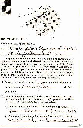 Discipulado realizado com Maria Lúcia, mãe de uma criança que participou da classe bíblica de evangelização realizada em Samambaia/DF, ela aceitou Jesus durante uma classe bíblica e passou a freqüentar uma igreja evangélica e ser discipulada pela missionária Rosângela.